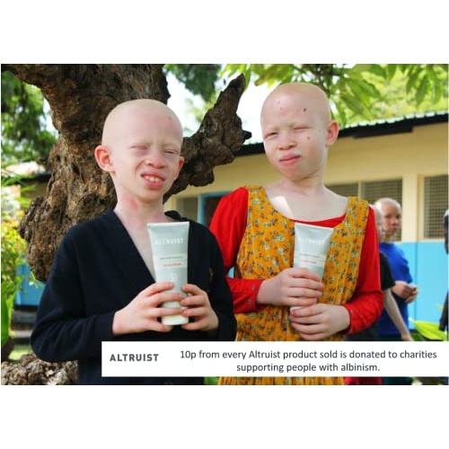 - ALTRUIST SUPPORTS PEOPLE WITH ALBINISM IN AFRICA – 10p from every Altruist product sold is donated to charities supporting people with albinism. In 2019 Altruist donated £65,000 worth of sunscreen to people with albinism in Africa.